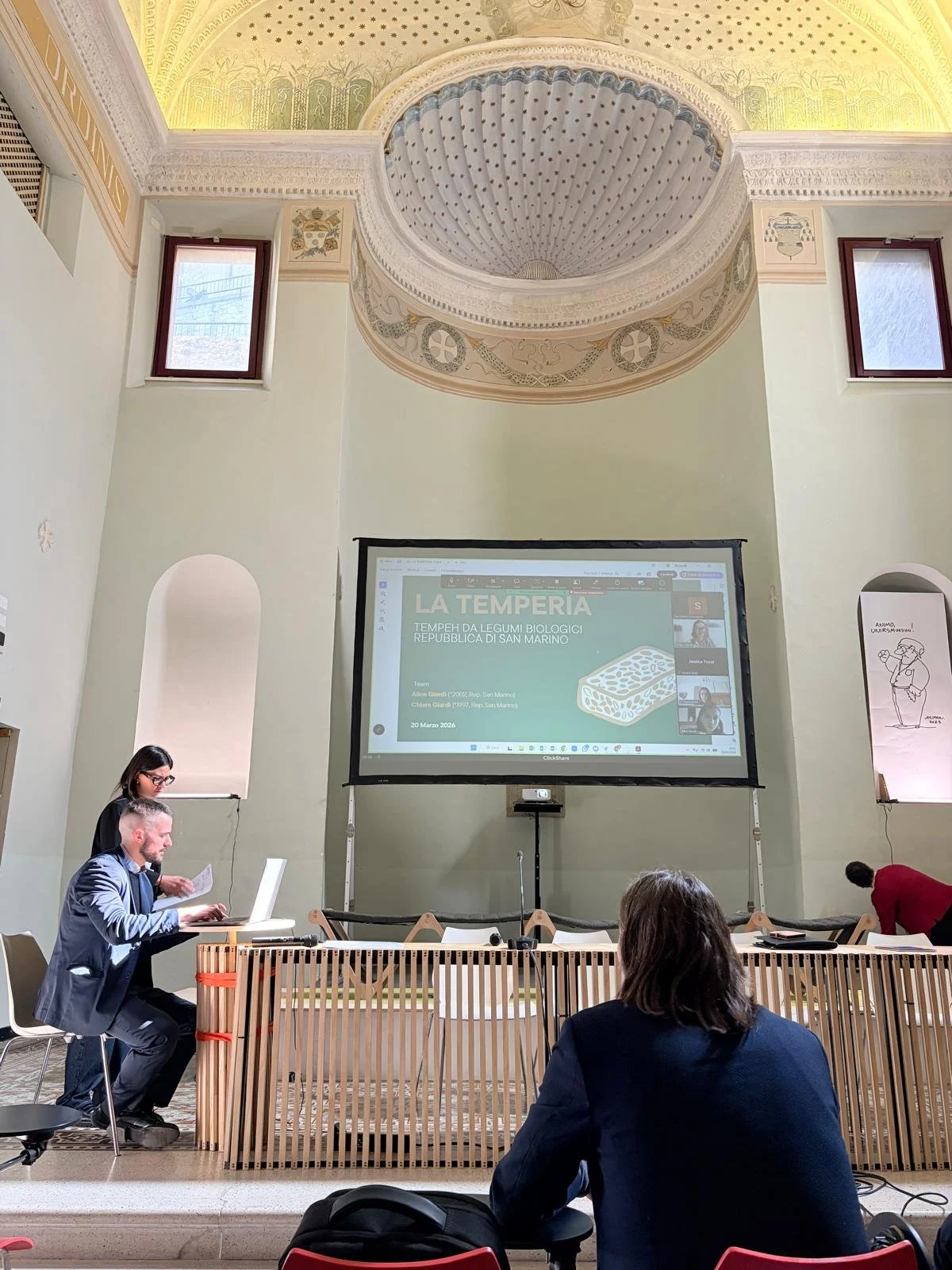 Tra i progetti premiati si posiziona al secondo posto TerraCore che si occupa di edifici e strutture in geopolimeri, materiali innovativi il cui utilizzo produce diversi benefici per l’ambiente. A realizzarlo tre studenti del corso di laurea in Design dell’Università degli Studi della Repubblica di San Marino: Cristiano Drudi, Giulia Badioli e Maria De Vita. Al terzo posto LA TEMPERIA che ha ideato un laboratorio artigianale che valorizza i legumi biologici locali attraverso un processo di fermentazione ispirato alla tradizione indonesiana delle sammarinesi Alice Giardi e Chiara Giardi.