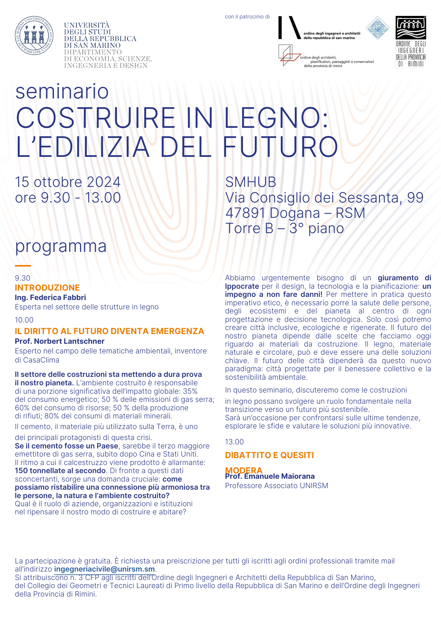 Qualora desideriate affrontare casi pratici o situazioni specifiche del vostro lavoro quotidiano, vi invitiamo ad inviarli alla mail della segreteria del Collegio (info@collegiodeigeometri.sm), in modo da poterli esaminare e preparare soluzioni concrete nel corso della seconda giornata.